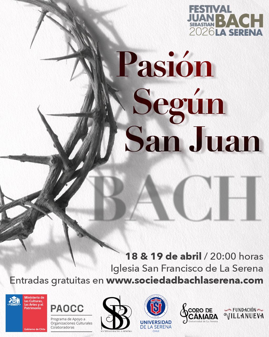 El director artístico de la Fundación Sociedad Bach La Serena, Manuel Figueroa Bolvarán, señala que “la primera versión del Festival Juan Sebastián Bach se pensó como una instancia cultural en torno a la Semana Santa, como una forma de invitar a la comunidad a disfrutar de las obras religiosas de este y otros autores. La región pudo disfrutar en 1960 de la Pasión según San Mateo gracias a Jorge Peña Hen, y hoy podrá apreciar la Pasión según San Juan, la primera pasión de Bach, que en sus 302 años de existencia nunca ha sido presentada en la Región de Coquimbo”.